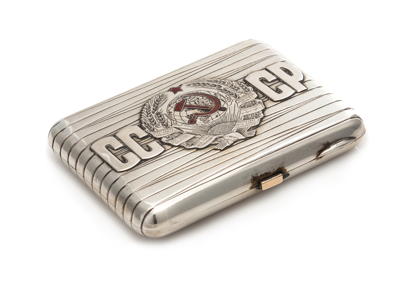 the banded case with applied letters and worked to show a symbol of International Socialism, with later enameling to the hammer and sickle.