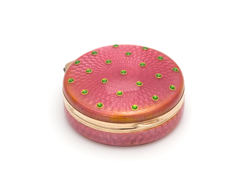 having a pink guilloche enameled ground and applied green paste elements to the lid.