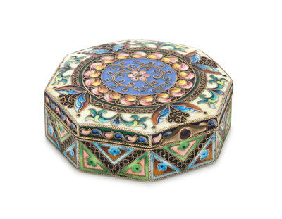 of octagonal form, the lid centered by an enameled rosette among polychrome foliate and volute decoration, the sides worked with geometric and bead motifs.