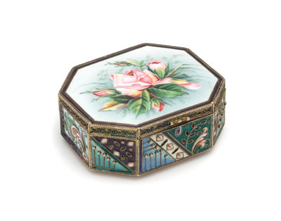 of elongated octagonal form, the lid enameled to show a floral spray, the sides worked to show foliate and geometric decoration.