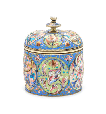 the lobed lid and body having a powder-blue enameled ground with polychrome floral and foliate motifs.