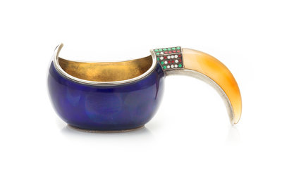 A Russian Enameled Silver and Hardstone Kovsh
