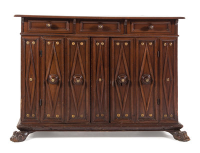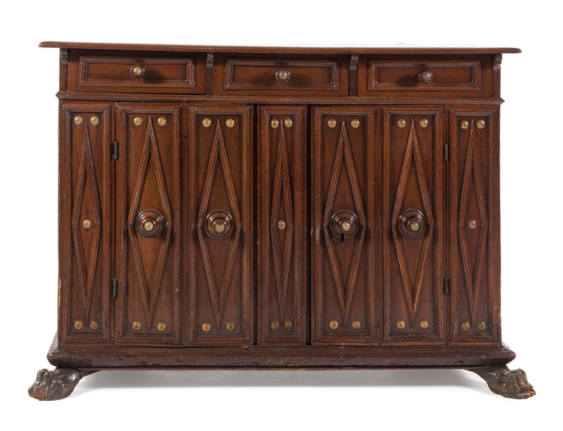 the rectangular top above three aligned drawers and two paneled doors opening to a shelved interior, raised on paw feet.