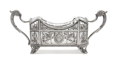 the handled pierce decorated body with a central cartouche flanked by griffins, the side panels worked to show foliate scrolls.