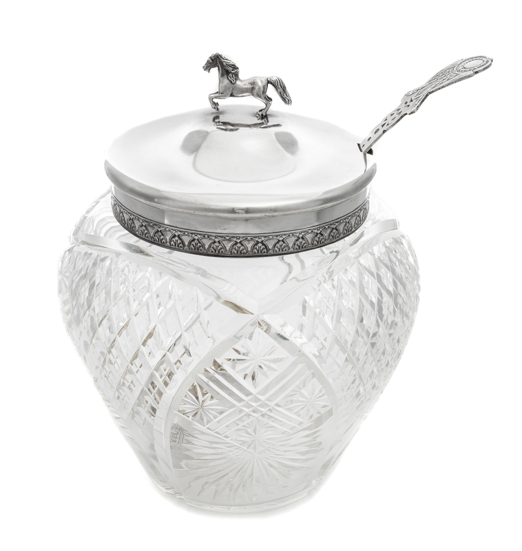 the lid with a horse finial, the cut glass body with a silver collar, the silver ladle having a pierced handle worked to show foliate swags.