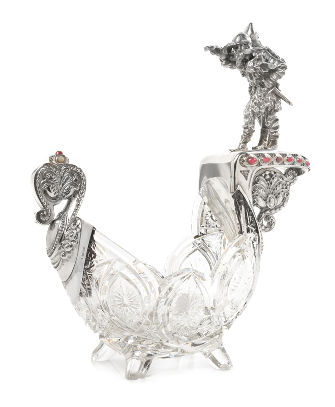 in the form of a boat, the silver prow having beaded decoration and worked to show ferns, the silver quarter-deck with two Bogatyr figures sumounting a stern inset with cabochons, the cut glass hull raised on splayed feet.