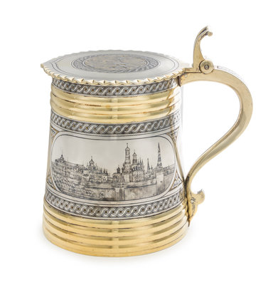 A Large Russian Silver-Gilt and Niello Decorated Tankard