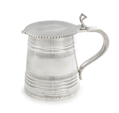 the lid centered by a vacant cartouche, the ribbed tapering body with engraved geometric bands.