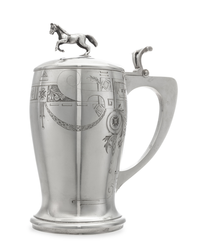 the domed lid with a later horse finial, the body engraved to show geometric, floral and foliate decoration.
