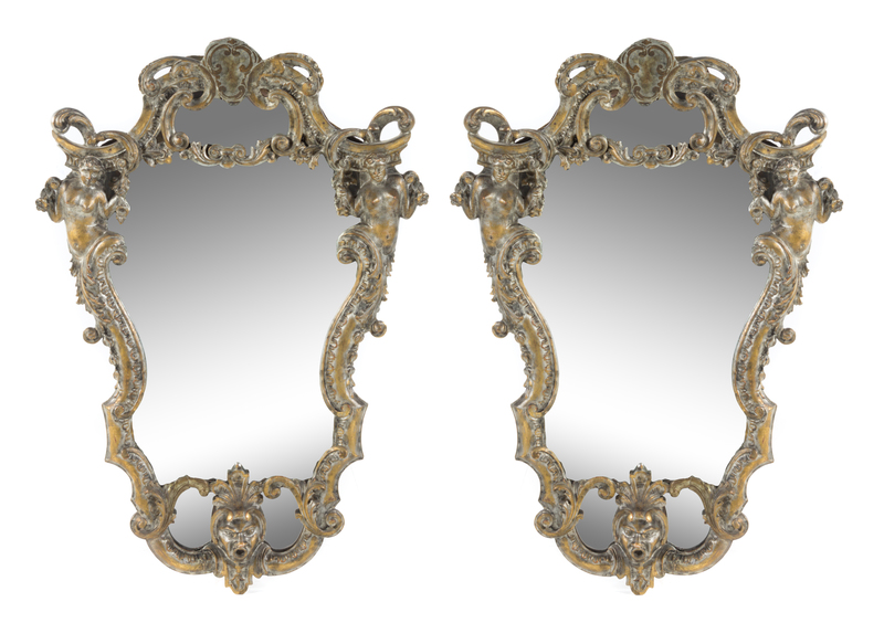 each of cartouche form, the crest carved to show rocaille and C-scrolls above the mirror plate within a conforming frame carved to show two nude maidens, rocaille and foliate scrolls, further terminating in a grotesque male mask.
