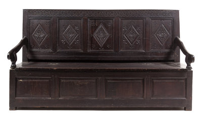 having a straight foliate carved crest rail above the paneled back carved to show paterae within lozenge form cartouches, the hinged seat within open arms over the paneled base, raised on bracket feet.