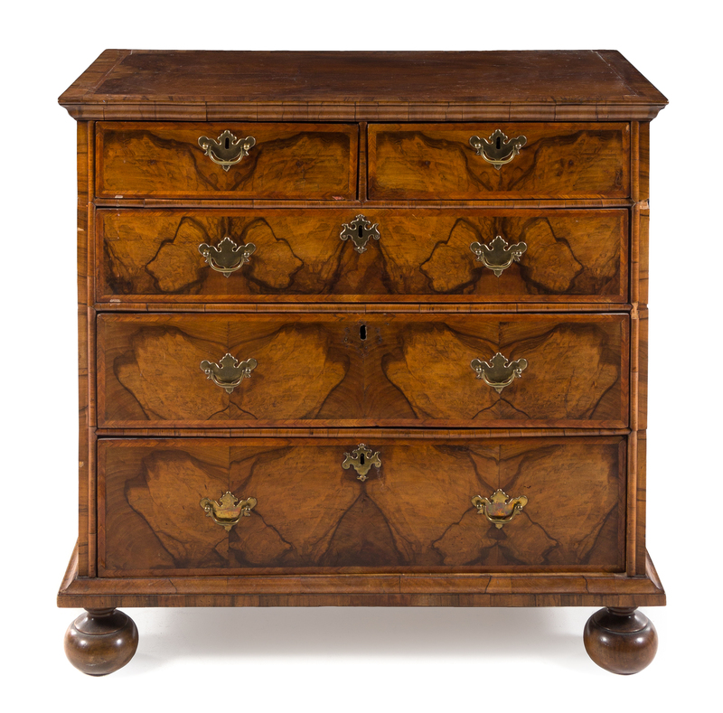 having a rectangular top above two aligned short drawers and three graduated long drawers, raised on ball feet.