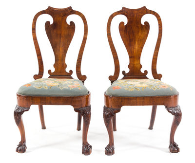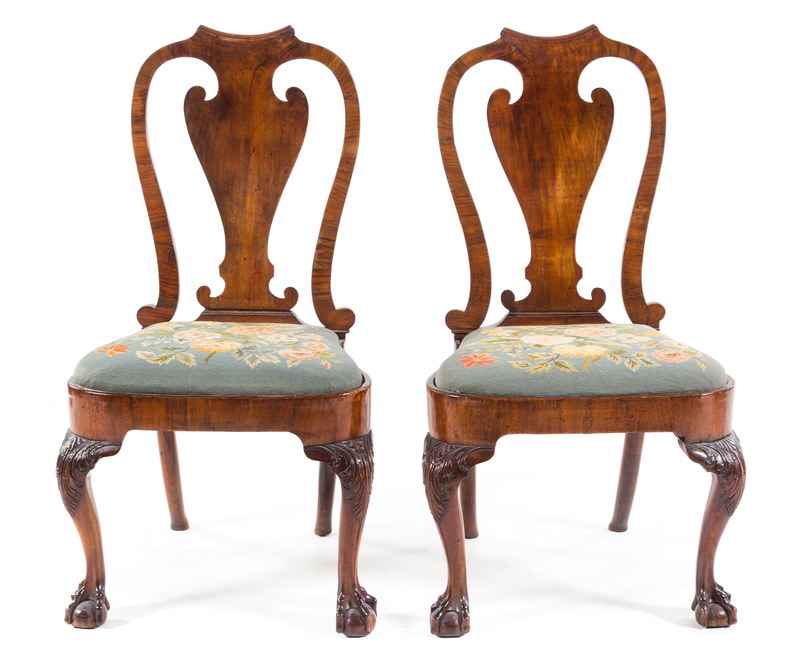 each having a curved crest rail above the vasiform splat and drop-in cushion seat, raised on acanthus carved cabriole legs ending in claw-and-ball feet.