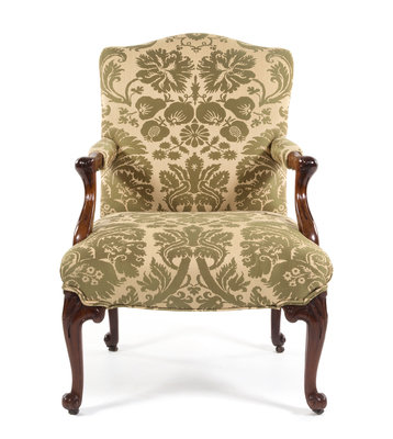 having a domed padded back, arms and stuffover seat, the arms with acanthus carved hand holds, raised on acanthus carved cabriole legs ending in scrolled toes and casters.
