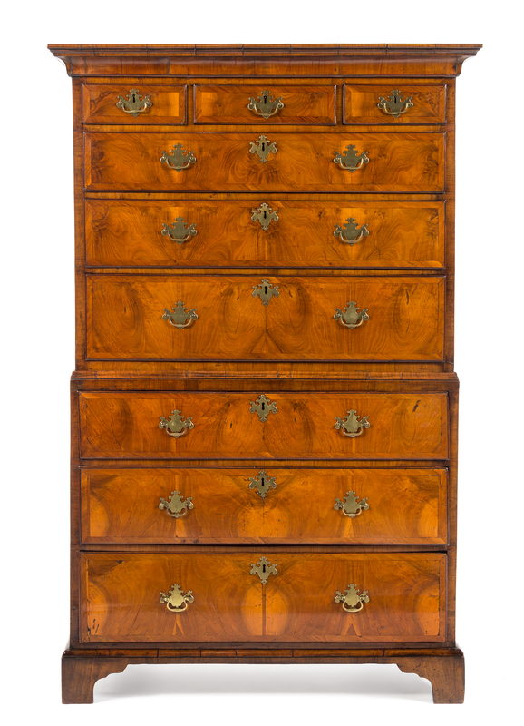 in two parts, having a molded projecting cornice above three aligned short drawers and three graduated long drawers, the base fitted with three graduated long drawers, raised on bracket feet.