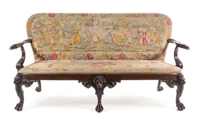 the needlepoint upholstered back and drop-in cushion seat within open arms heavily carved to show rocaille and acanthus leaves ending in eagle head hand holds, raised on legs headed by lion masks flanked by flowers and acanthus leaves and ending in hairy paw feet.