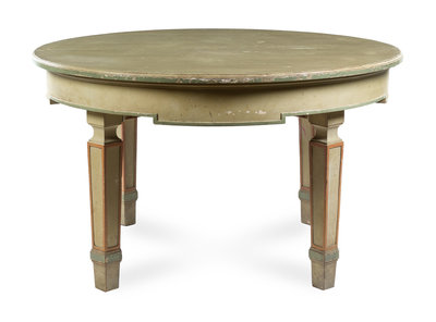 having a circular top with a molded edge, raised on square tapering legs, with two leaves, extending to seat ten.