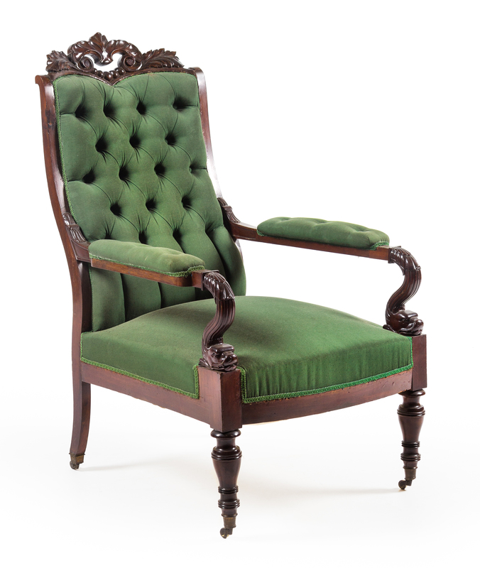 the shaped openwork crest rail carved to show foliate scrolls above the tufted back, arms and stuffover seat, the arms carved to show stylized dolphins, raised on ring turned cylindrical tapering legs ending in casters.