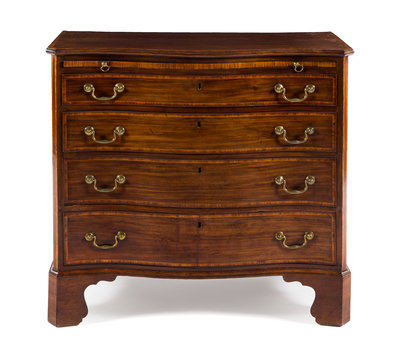 the serpentine top with canted corners above the conforming case fitted with a slide and four graduated long drawers, raised on bracket feet.