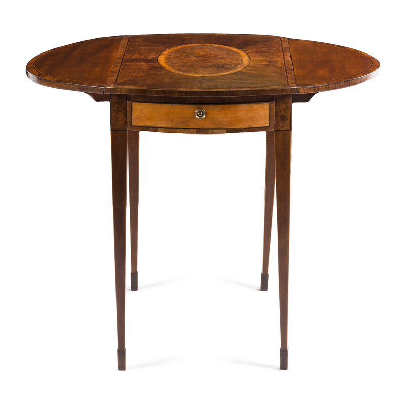 the rectangular top with bowed edges and two D-shaped leaves inlaid with an oval cartouche above the single frieze drawer, raised on square tapering legs ending in spade feet.