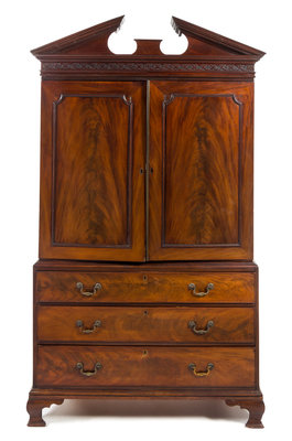 in two parts, the superstructure with a broken arch pediment having dentiled and blind fret decoration over two doors opening to a fitted interior, the base set with three graduated drawers, the whole raised on bracket feet.