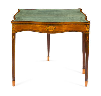 the serpentine hinged top opening to a green suede inset playing surface, the conforming frieze inlaid to show a shell and flowering vines and flowering vases at the corners, raised on square tapering legs ending in spade feet.