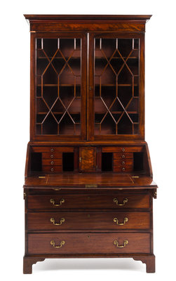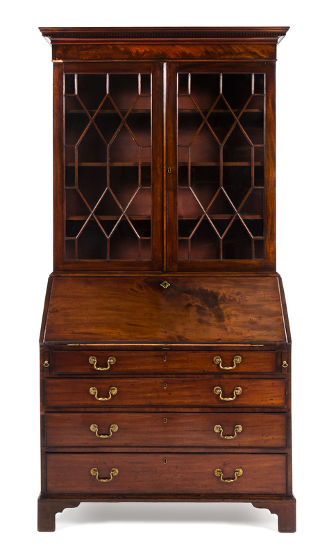 in two parts, the superstructure having a dentiled projecting cornice above a plain frieze and two glazed doors with mullions opening to a shelved interior, the base having a slant-front opening to a fitted interior with a leather-inset writing surface, further fitted with four graduated long drawers, raised on bracket feet.