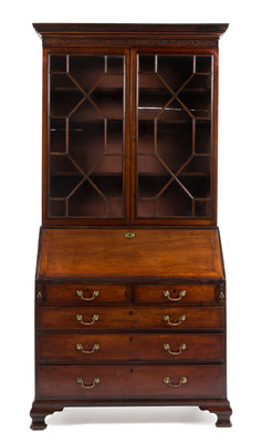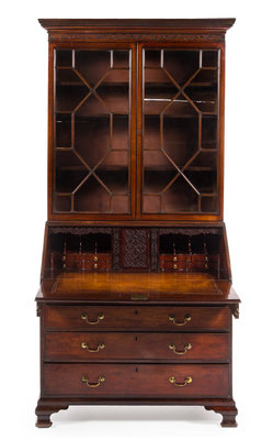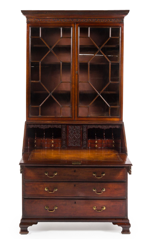in two parts, the superstructure having a molded projecting cornice with dentiled decoration and a fretwork band carved to show foliate scrolls above two glazed doors with mullions opening to three shelves, the base fitted with a fall-front opening to a fitted interior with carved fretwork decoration and a leather-inset writing surface, further over two aligned short drawers and three graduated long drawers, raised on ogee bracket feet.