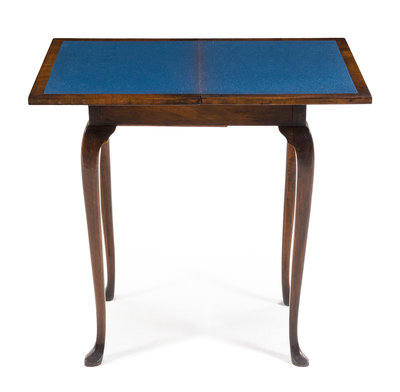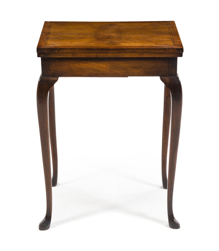 the hinged rectangular top pivoting and opening to a rectangular felt-lined playing surface above the plain frieze, raised on cabriole legs ending in pad feet.
