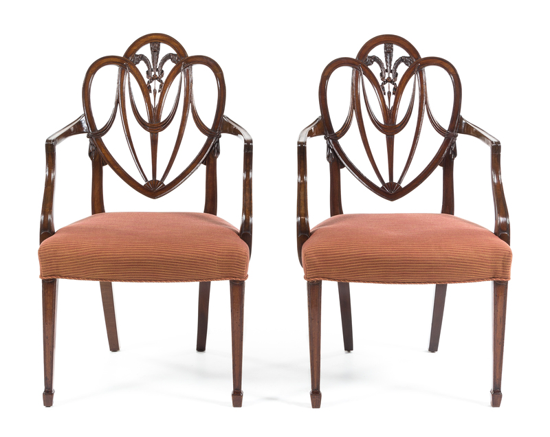 each having a shield form Feather and Drapery back carved to show Prince-of-Wales feathers and drapery swags above the stuffover seat within open arms, raised on square tapering legs ending in spade feet.