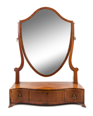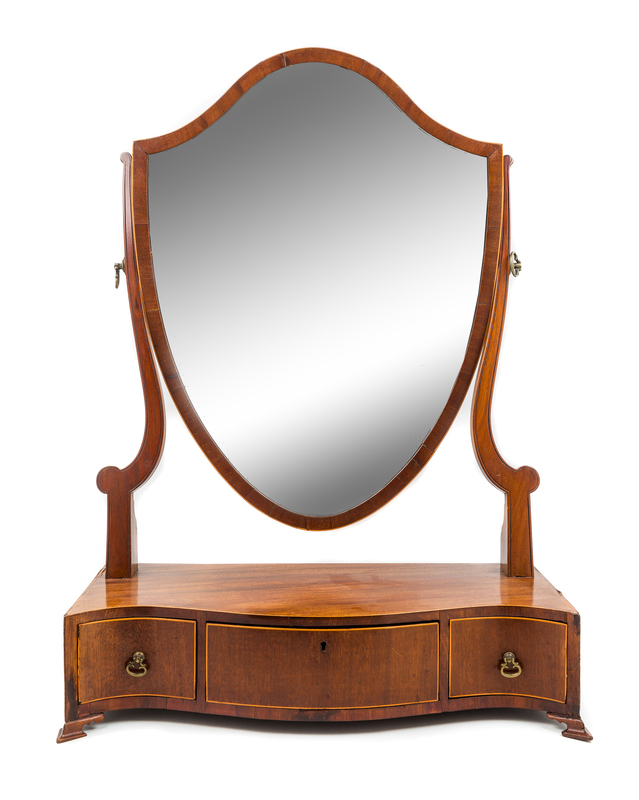 the shield form mirror plate above the serpentine case fitted with three drawers.