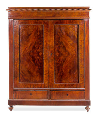 having a molded projecting cornice with beaded decoration above a plain frieze and two paneled doors with conforming beaded decoration and two drawers, raised on toupie feet.