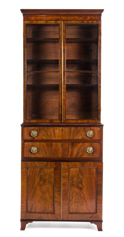 in two parts, the superstructure having a molded projecting cornice above the plain frieze and two glazed doors opening to a shelved interior, the base fitted with two long drawers and two doors opening to a shelved interior, raised on bracket feet.