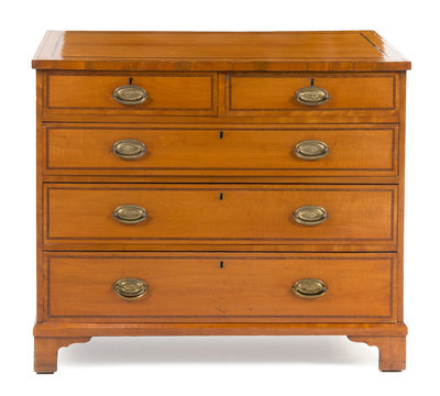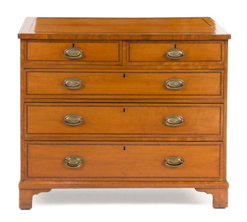 having a rectangular top above the case fitted with two aligned drawers and three graduated long drawers, raised on bracket feet.
