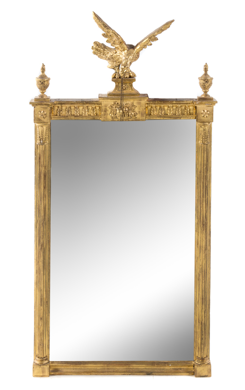 the straight crest of breakfront outline surmounted by a spreadwing eagle flanked by flaming urn finials above the frieze centered by a tablet carved to show a fruit basket in relief, the vertical rectangular mirror plate flanked by reeded columnar pilasters headed by Egyptian capitals.