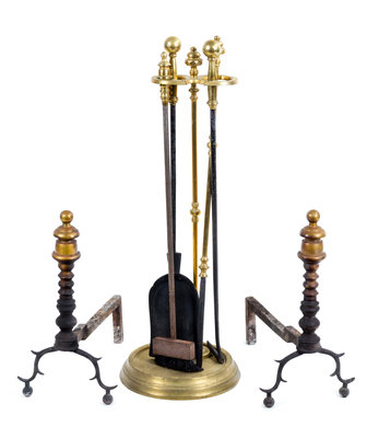 each having an urn form finial above the turned baluster standard and spurred cabriole legs ending in ball feet, together with a set of three fireplace tools on stand.