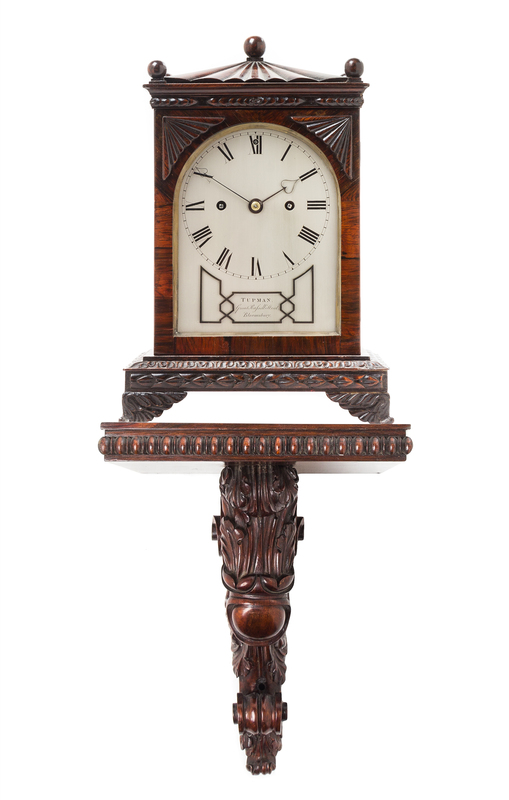 the case having three ball finials above the circular dial with Roman numeral hours, signed Tupman/ Great Russell Street/ Bloomsbury, raised on a foliate carved base, set on an associated 19th century carved wood bracket.