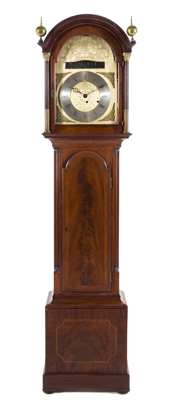 the hood having a domed cornice with two brass ball finials above the glazed door flanked by fluted Corinthian columnar supports and enclosing a silvered chapter ring with Roman numeral hours, the straight trunk fitted with a door and flanked by fluted columnar pilasters, raised on flattened bun feet.