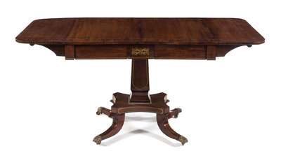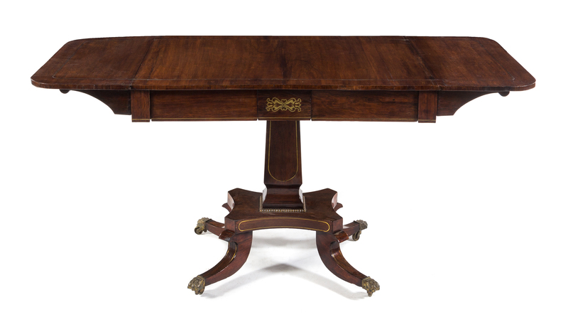 having a rectangular top and two D-form drop leaves above two frieze drawers, set on a square tapering standard, raised on splayed legs ending in cast paw feet and casters.