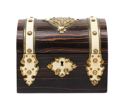 having a domed hinged lid opening to a vacant cloth-lined interior.