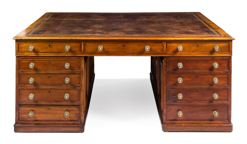 the tooled leather-inset top raised on twin pedestals, each fitted with a series of drawers, raised on plinth bases.