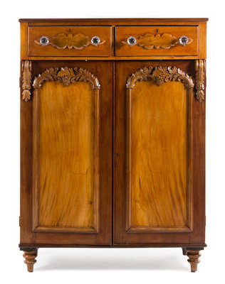 the rectangular top above two aligned short drawers and two paneled doors carved to show grape bunches flanked by foliate scrolls, raised on toupie feet.