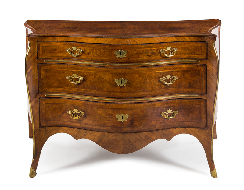 the serpentine top above the conforming case fitted with three graduated drawers, raised on slightly splayed legs.