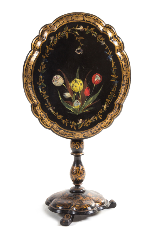 the lobed oval top painted to show tulips within foliate borders, set on a baluster form support ending in a lobed base with three feet.