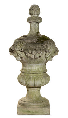 surmounted by a pine cone finial, draped with floral swags accented with acanthus leaf decoration, raised on a fluted socle and a square base.