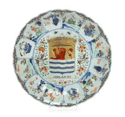 centered with the arms of Zeeland above a banderole inscribed Zeelandt among birds, butterflies and floral sprays, all within a border having a lobed rim and depicting alternating panels of various figures and flowering vessels.