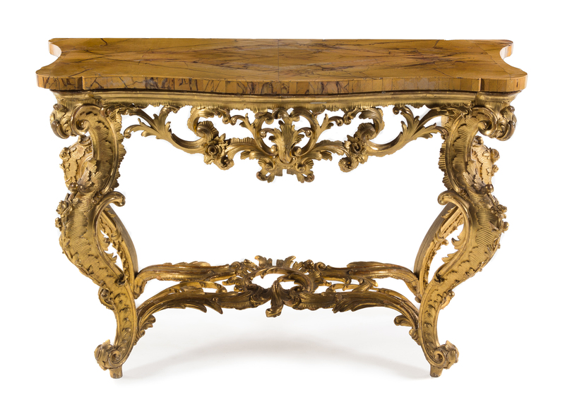 the top of serpentine outline above the conforming frieze pierce carved to show rocaille, flowers and foliate scrolls, raised on S-scroll legs carved to show rocaille, flowers and foliate scrolls ending in scrolled toes, the legs joined by a similarly pierce carved stretcher.