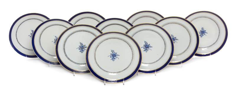 each centered with a floral spray against an ivory ground within cobalt borders having gilt highlights.