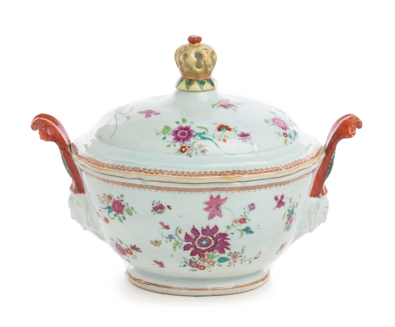 the domed cover having a pierced crown finial, the handles modeled to show grotesque male masks wearing intricate headdresses of plumage, painted throughout in famille rose enamels to show stylized blossoms.