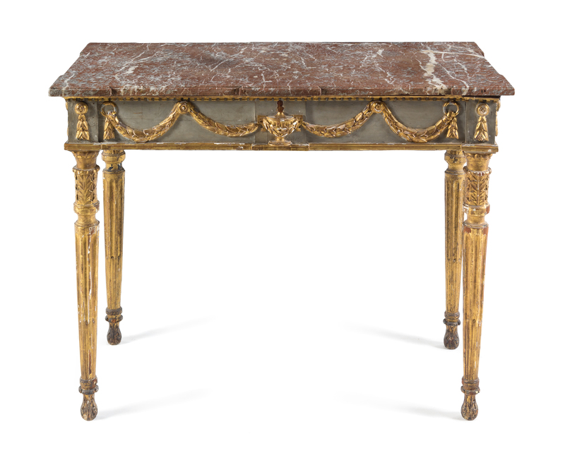 the rectangular marble top with a molded edge above the dentiled frieze carved to show urns flanked by bellflower swags in relief, raised on fluted cylindrical tapering legs.